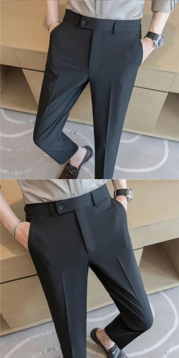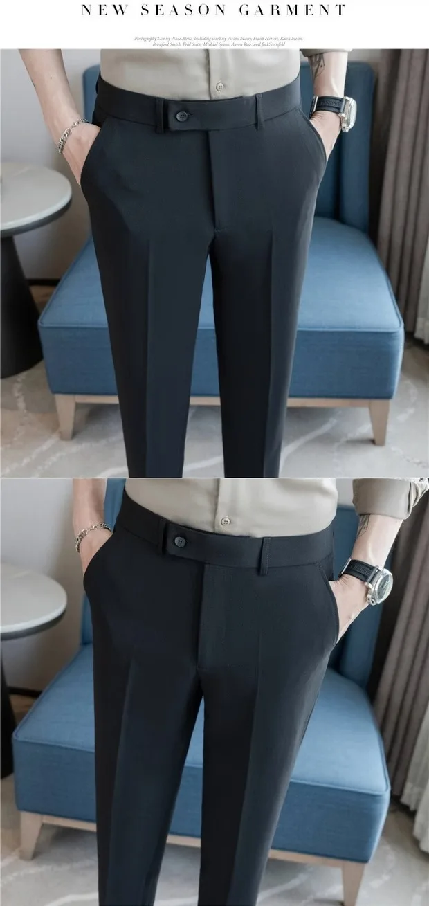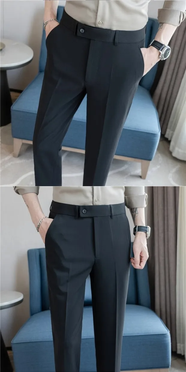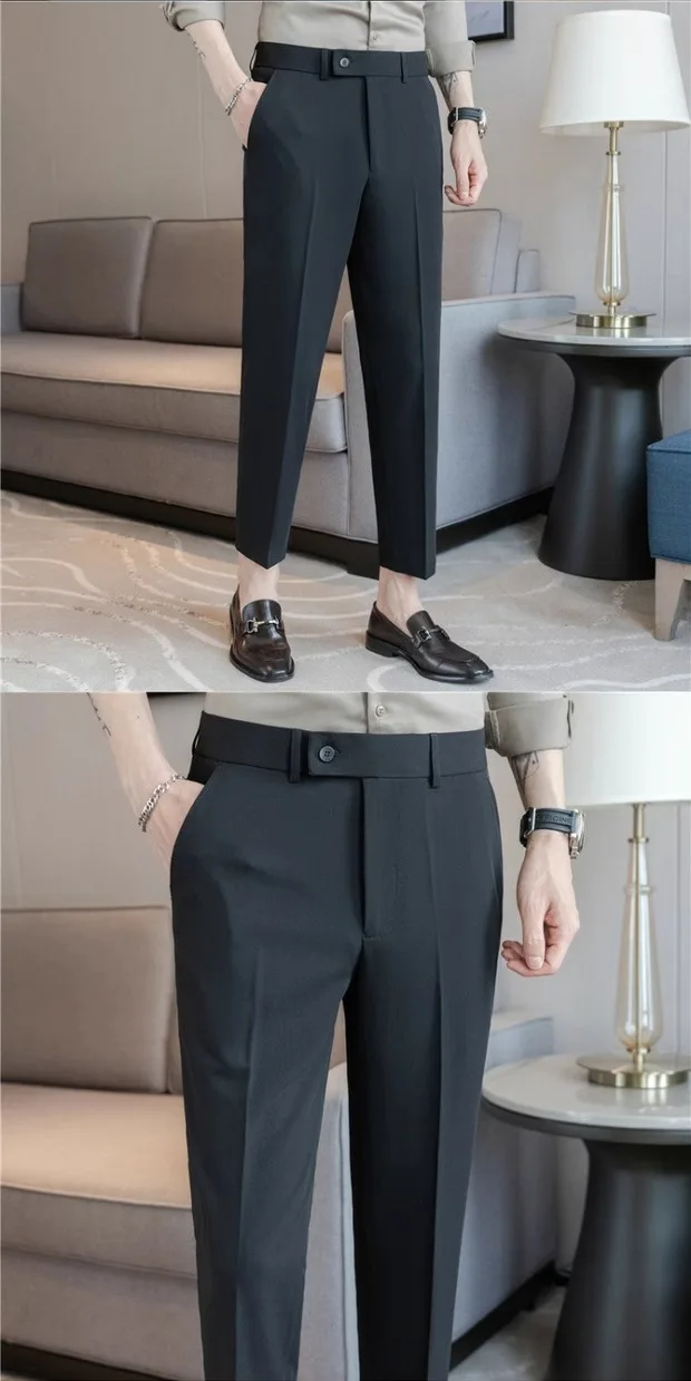 Este par de calças apresenta um estilo casual de negócios, perfeito para um look moderno e elegante no ambiente de trabalho.